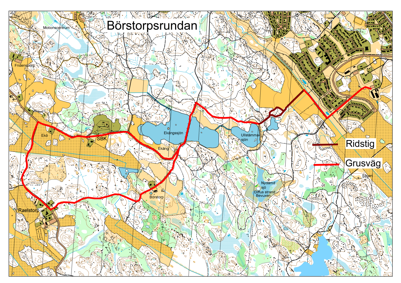 Längd ca. 8,3 km. Ridtid: 1 h, 15 min. Börstorpsrundan bjuder på mycket grusväg, med möjlighet till trav och gallopp. Sträckan är mindre belagd av motionärer på cykel eller till fots och lämpar sig därför till trav och gallopp. Delar av rundan går utmed bilvägen förbi Rosenkälla (Rosenkällavägen). Att skritta utmed bilvägen tar knappt 10 min.