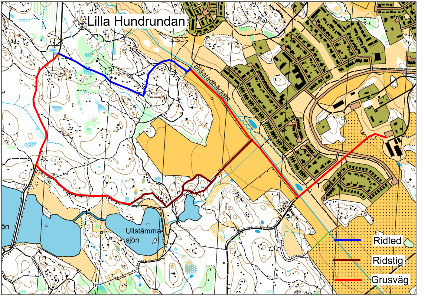 Längd ca. 4,3 km. Ridtid ca 40 min. Lilla Hundrundan passar som kortare runda med trav- och gallopp-träning på delar av rundan. Även på denna runda tipsar vi om att rida dagtid vardagar eller mornar/kvällar på helger, om man vill hålla lite tempo. Övriga tider är rundan ett populärt promenadstråk.