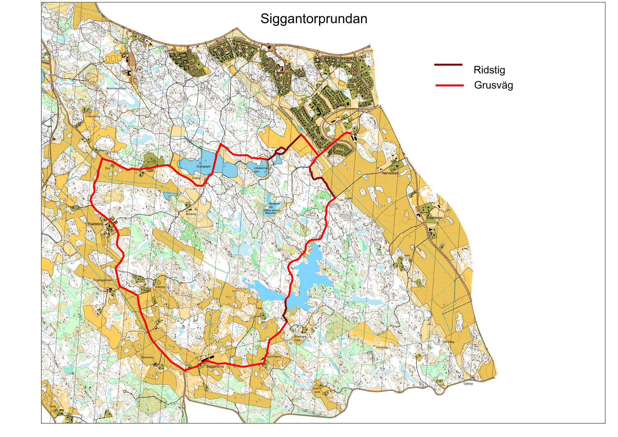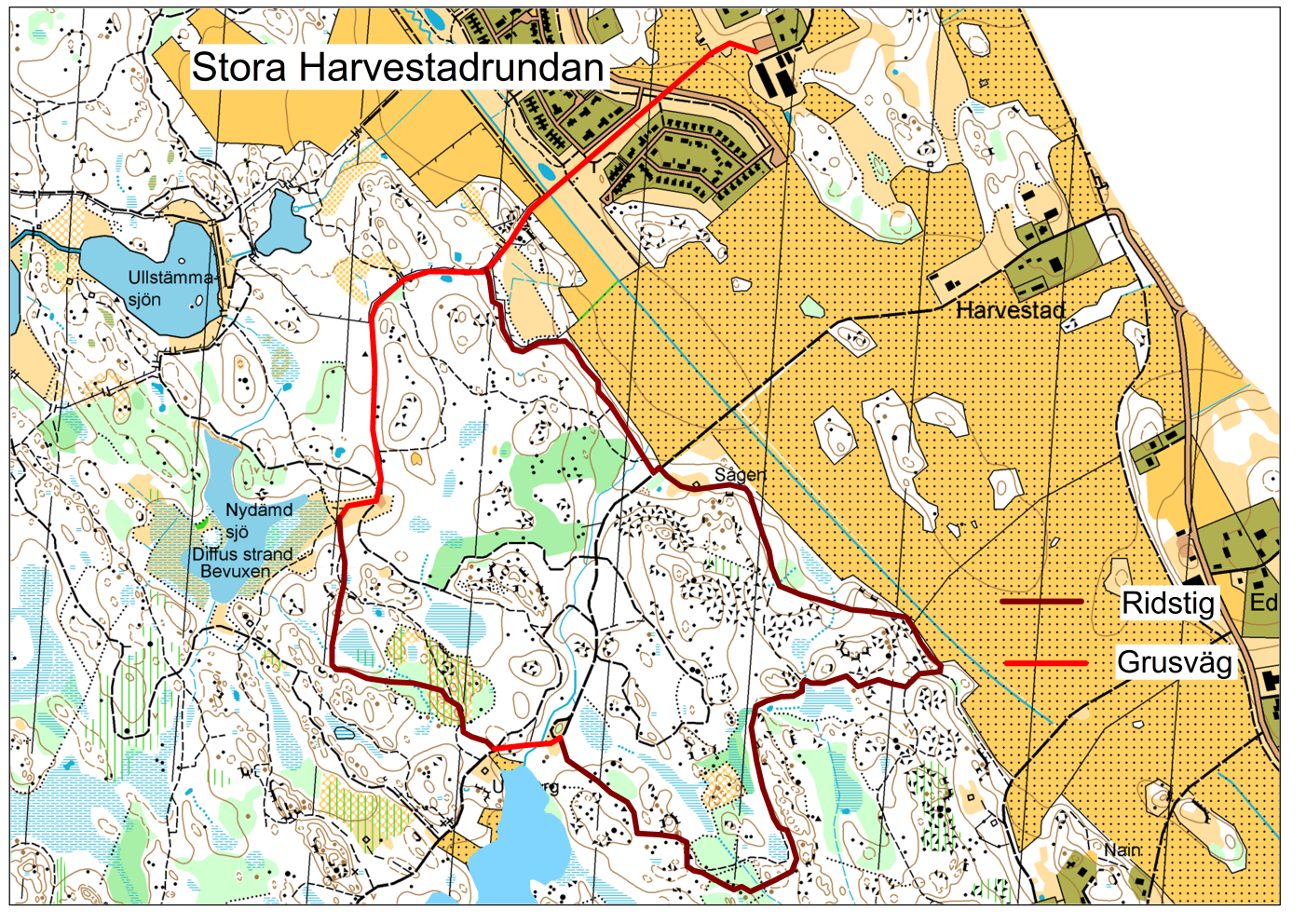 Längd ca. 3,5 km. Ridtid ca 45 min. En kortare runda med blandning av grusväg och stig. Flera alternativa stigar finns att välja på mellan Harvetstadsvägen och Sams Ridväg. Harvestadsvägen är utmärkt för gallopp-träning, dock är Harvestadsvägen välbesökt av fotgängare och cyklister mitt på dagen på helger. Dessa tider behöver vi som ryttare hålla lägre tempo. Mornar är ett utmärkt tillfälle för den som vill hålla högre tempo.