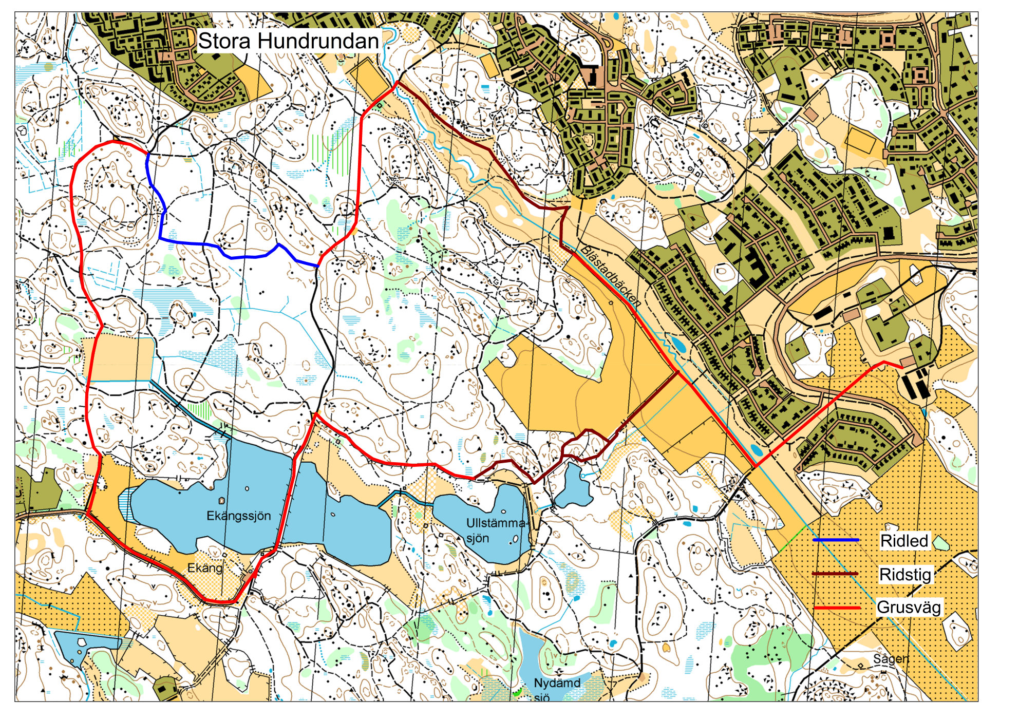Längd ca. 7 km. Ridtid ca 1 timme. Stora Hundrundan går till stora delar på grusväg. En härlig runda med mycket variation och vacker natur. Här har du möjlighet till en hel del trav och gallopp, varierat med skritt på skogsstig.